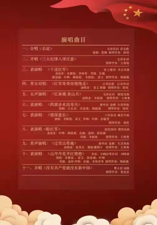 红军于1936年10月在甘肃会宁地区,红军三大主力会师,标志着万里长征的胜利结束。最后一首歌曲是耳熟能详的《没有共产党就没有新中国》,伴随着铿锵有力的旋律,演唱者们挥舞着国旗,演唱的更加激情澎湃。在纪念红军长征胜利80周年大会上,习近平总书记深刻总结了长征的伟大意义和精神内涵,生动阐释了长征精神跨越时空的时代价值。没有共产党就没有新中国,演唱者们用歌声赞美各位先辈,正因为他们的无私付出,才使得今天我们的国家繁荣富强!没有共产党,就没有我们的新中国!