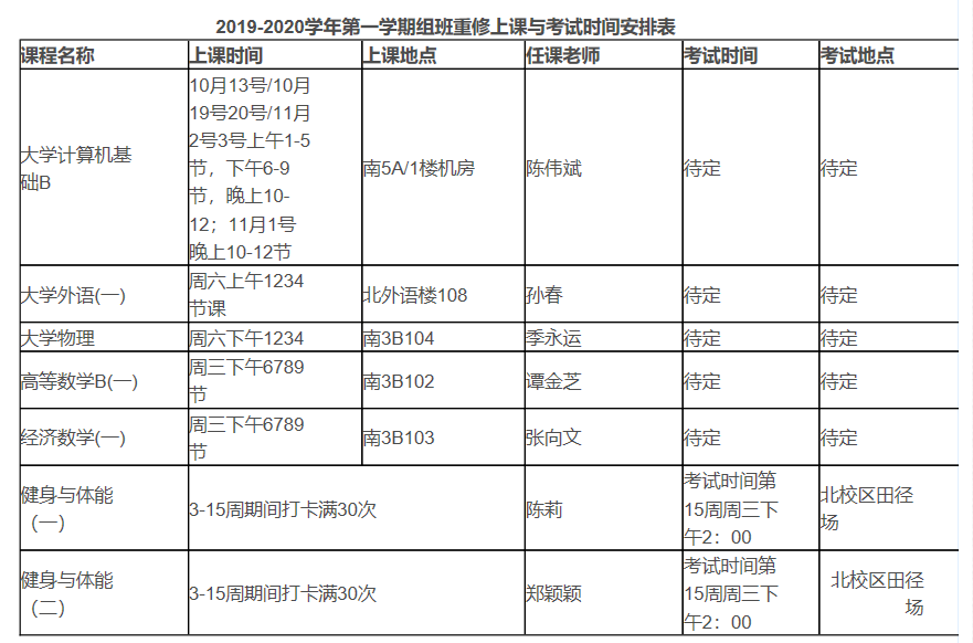 1、组班重修的课程按照《2019-2020学年第一学期组班重修上课与考试时间安排表》进行修读。