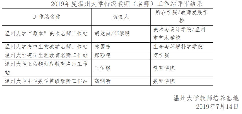 根据《温州大学特级教师(名师)工作站管理办法(试行)》(温大行政〔2018〕74号)文件的相关规定,经校内专家评审,同意“温州大学‘原本’美术名师工作站”等五个工作站立项为2019年度温州大学特级教师(名师)工作站建站。现将评审结果予以公示,公示时间为五天(7月14日-7月18日)。如有异议,请与温州大学教师培养基地朱伟老师联系,联系电话:665134。