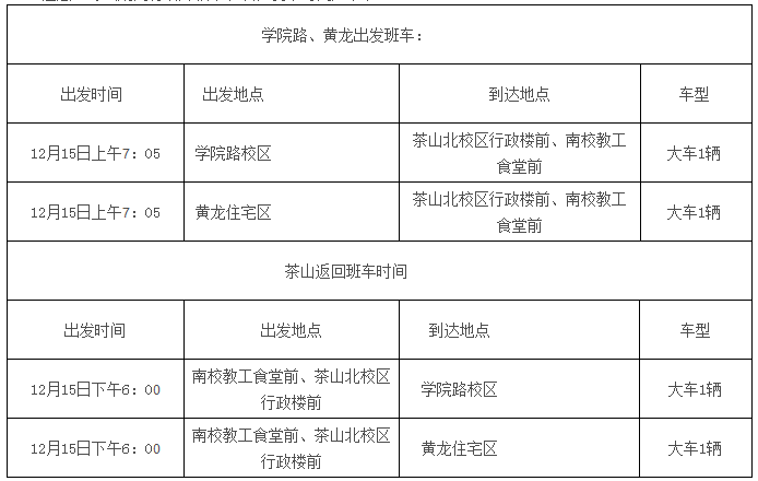 注意:考试期间将增开校车班次,发车时间如下表: