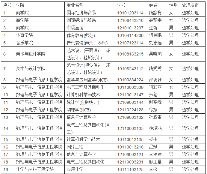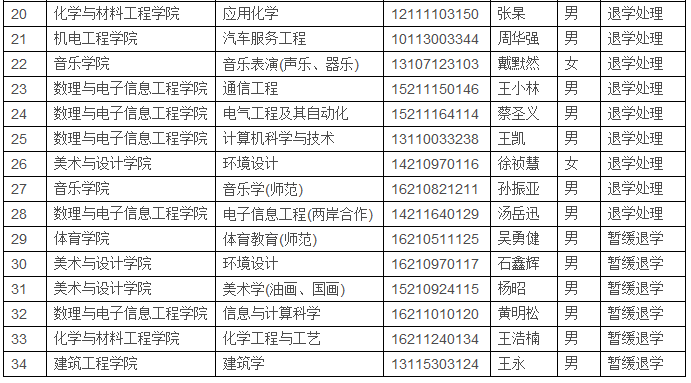 根据《温州大学本科学生学籍管理规定(2018年修订)》(行政〔2018〕13号)第二十九条、第三十条和第三十八条,经校长会议研究决定,拟对陆静梅等34名学生作退学或暂缓退学处理,特此公示。